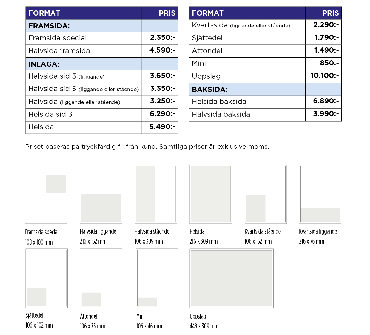 Priset gäller alla format förutom Mini, där vi tar 350 kr