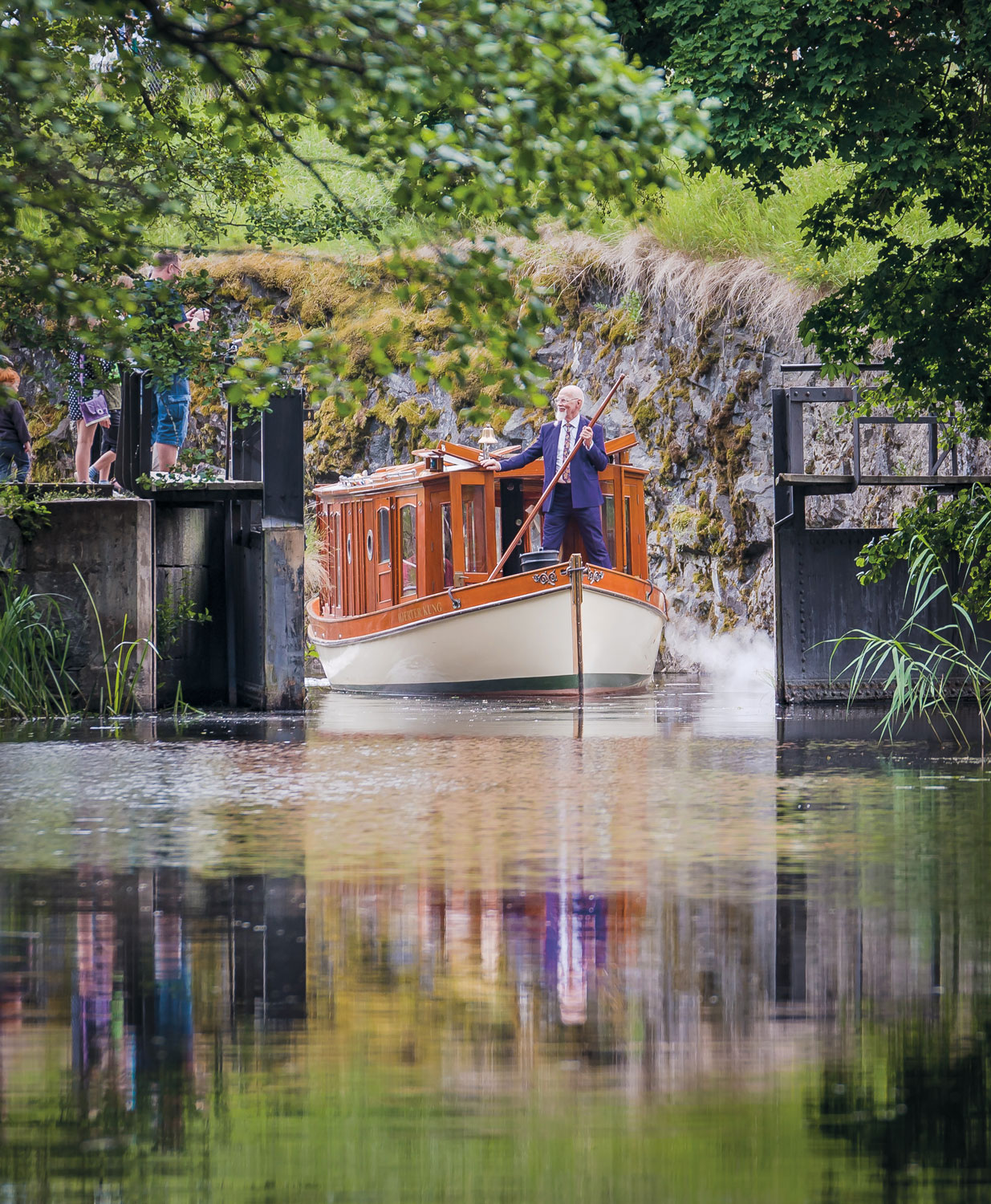 Hjerter Kung går ut från slussen i Åkerskanal för att hämta ett bröllopspar med gäster, på fördäck står vigselförrättaren med båtshaken i högsta hugg.
